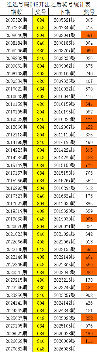 从上表统计不错看出,直选号码048开出之后,其下期奖号:
