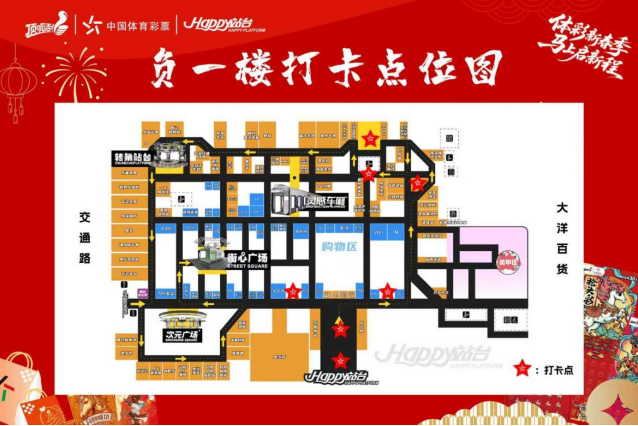 本次活动覆盖Happy站台正门口、C馆大堂、核心通道、楼梯等多个区域,以红金新春配色融合情人节浪漫元素,打造17个特色打卡点。乐小星高悬玻璃棚顶,“马上启新程”主题IP,还有新春祝福吊牌、灯笼等场景。C馆大堂的公益展示区,更将全方位呈现体彩公益理念,让市民在欢乐中感受公益力量。