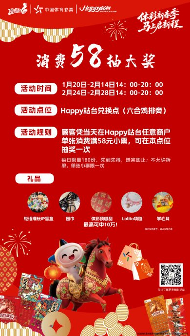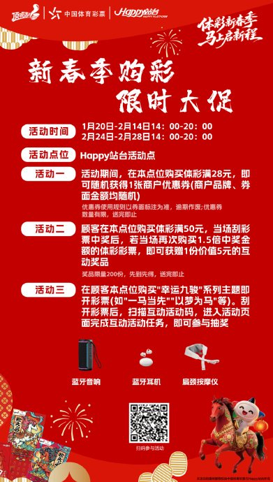 1月15日起,启盈优配Happy站台四大活动点位(六合鸡排旁、1楼市集摊位等)同步开启购彩好礼:满28元即赠随机商户优惠券,吃喝玩乐一站式省钱;满50元中奖后,再购1.5倍中奖金额彩票,可获价值5元互动奖品(限量200份);购买“幸运九骏”系列即开票,扫码完成互动任务,即有机会抽取蓝牙音响、蓝牙耳机、肩颈按摩仪等惊喜好礼。