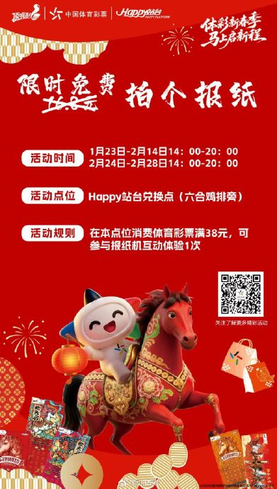 1月23日起,购彩满38元即可参与报纸机互动体验,定格新春美好瞬间。2月14日情人节当天,正门口将举办“爱在Happy·为爱添彩”双人挑战活动,通过公主抱挑战、默契问卷、公益签名墙三连打卡,可兑换密码卡片赢取盲盒、商户优惠券等好礼。更有体彩吉祥物乐小星全场巡游,陪你共度浪漫佳节~