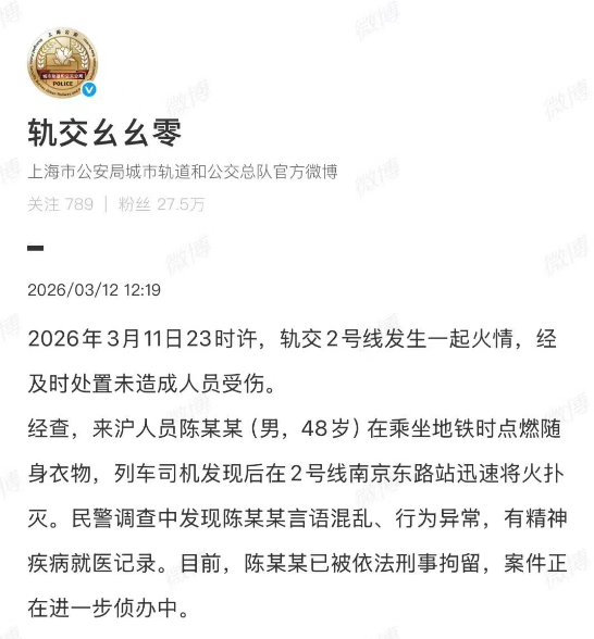 3月12日,上海市公安局城市轨谈和公交总队官方微博发布最新通报: