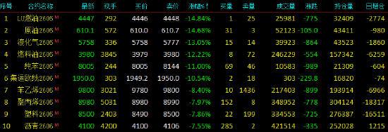 2026年4月8日,早盘开盘,国内期货主力合约跌多涨少,配资门户网低硫燃料油(LU)、SC原油跌超14%,液化气跌超13%,燃料油跌超12%,纯苯跌超11%,集运欧线跌超10%,苯乙烯跌超8%,聚丙烯、塑料、沥青跌超7%。贵金属高涨,沪银涨超4%,铂、钯涨超3%。