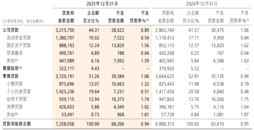 从不良贷款结构来看,公司贷款不良率为0.89%,较上年末下落0.17个百分点;零卖贷款的不良率为1.06%,较上年末增长0.1个百分点。在零卖贷款中,小微贷款和个东说念主住房贷款的不良率较上年末有所高潮,永别较上年末增多0.43个百分点、0.03个百分点。