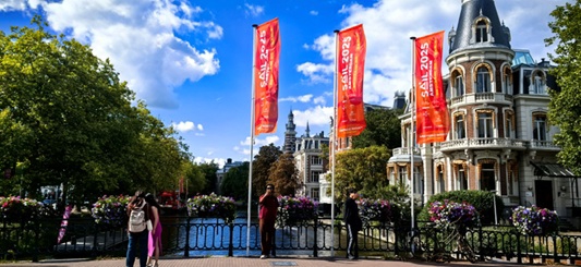 惊喜从还未登船就运转了。中央火车站站前广场和轮渡船埠东说念主潮倾盆,原因是咱们正好赶上了第十届阿姆斯特丹风帆节(SAIL Amsterdam)。这一节日每5年举办一次,自1975年创立以来,已成为全球范围最大的风帆举止之一。本届举止赶巧阿姆斯特丹建城750周年和风帆节创办50周年,相较以往范围愈加庞大。
